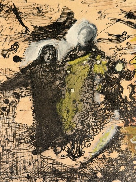 Two figures attempting to figure it, life out, Pen, ink, watercolour, gouache. 2025